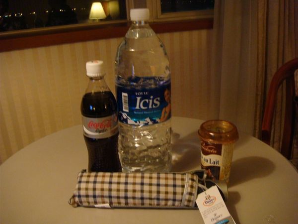 這是去程的飛機餐,主食是雞肉麵,雞肉味道還可以,配上炒的高麗菜,麵條用的是一般的扁麵條,口感是很好,有點糊掉的感覺。附餐的麵包因為有重新加熱,所以吃起來香味十足,口感也很綿密;生菜沙拉還滿新鮮的,配上芝麻和風醬,微酸的味道,有開胃之功效,所附的甜點看起來就不是很好吃,而美人魚和北極熊都不是很愛甜食,所以也就沒有品嚐了