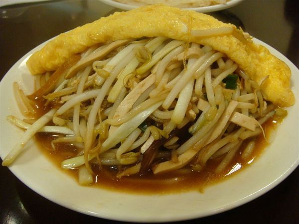 合菜玳帽-用豆干、豆芽菜、木耳及韭菜等一同去快炒,上面再蓋上一層蛋皮,這可是很有名的料理,豆芽菜炒的很清脆,豆干及木耳也都炒的很入味,包在斤餅中,十分的好吃,也是為其主要是用來包在斤餅中吃的,所以味道有點偏重,可是還不會過鹹