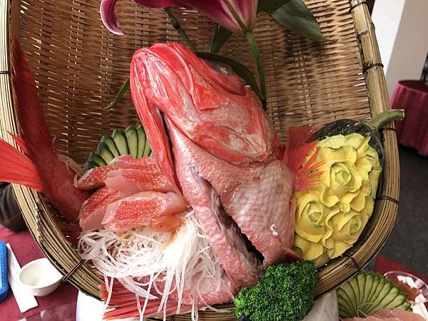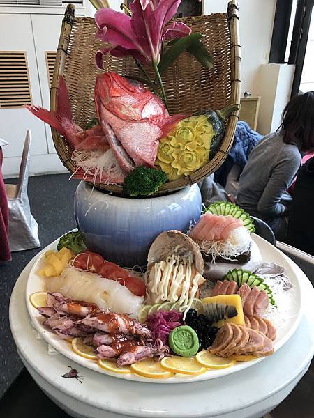 旗魚、鮑魚、黃金魚、花枝、小卷跟金桔肉捲等海鮮拼盤