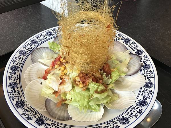 扇貝沙拉,上面是麥芽糖